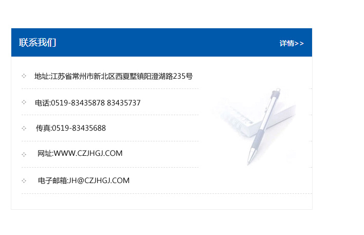 地址:常州市新北區友邦商務大廈1幢16、17層  電話:0519-85101652  傳真:0519-85112595  郵編:213022  網址:www.cz-jiayue_cn.yongyedg.com  郵箱:xiajifengaa@163.com